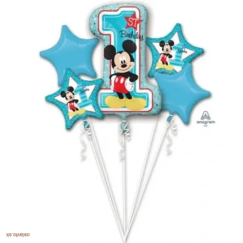 Sada fóliových balónikov 1st birthday Mickey, ktorý nesmie chýbať na rovnomennej tématickej oslave. Tento balónový set je ideálnou voľbou pre každého, kto chce rýchlo a jednoducho pripraviť efektnú narodeninovú alebo párty výzdobu. Set obsahuje 5kusov fóliových balónov nápis „1st Birthday“, balón číslo 1 a hviezdičkové balóny v obľúbenom Mickey Mouse dizajne vo veľkosti XL .