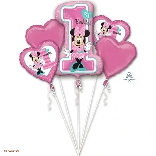 Sada fóliových balónikov 1st birthday Minnie Mouse, ktorý nesmie chýbať na rovnomennej tématickej oslave. Tento balónový set je ideálnou voľbou pre každého, kto chce rýchlo a jednoducho pripraviť efektnú narodeninovú alebo párty výzdobu. Set obsahuje 5kusov fóliových balónov nápis „1st Birthday“, balón číslo 1 a hviezdičkové balóny v obľúbenom Minnie Mouse dizajne vo veľkosti XL .
