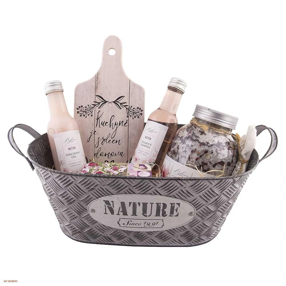 Darčekový plechový kôš Ruža – kozmetika, kúpeľová soľ a dekorácia