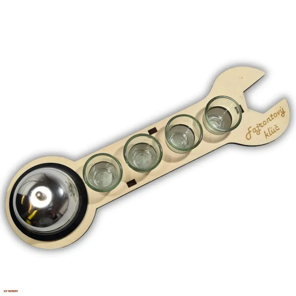 HUMORNÝ DARČEK DREVENÝ FAJRONTOVÝ KĽÚČ / 4 POHÁRIKY A ZVONČEK