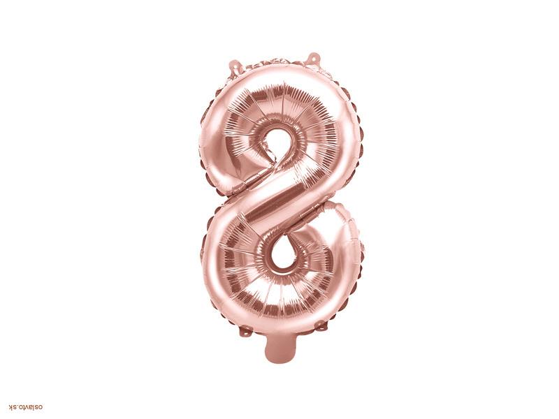 Foliová číslica 8 v rose gold farbe, balónik sa vďaka svojej veľkosti ani po nafúknutí héliom nebude vznášať. Odporúčame nafúknuť len vzduchom.