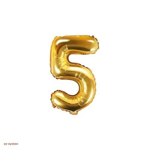 Foliová číslica 5 v zlatej farbe, balónik sa vďaka svojej veľkosti ani po nafúknutí héliom nebude vznášať. Odporúčame nafúknuť len vzduchom.