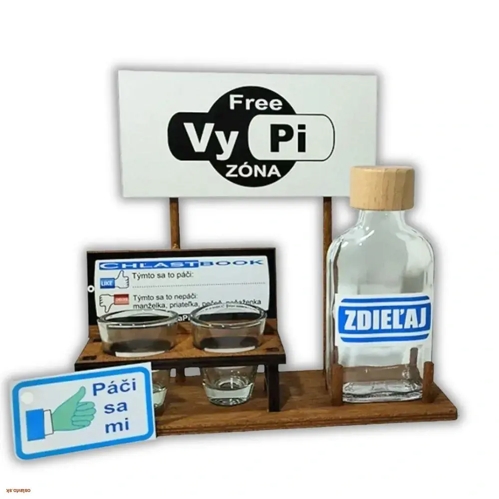 Táto drevená zostava s názvom VyPi zóna je ideálnym doplnkom do každej chalupy, pivnice, kancelárie alebo man cave. S humorom odkazuje na svet sociálnych sietí – ale tu sa nelajkuje, tu sa zdieľa tekutý obsah!
