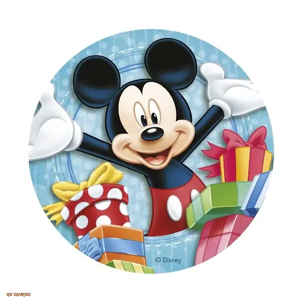Rozveseľte každú detskú tortu jedlým obrázkom Mickey Mouse 20 cm. Vyrobený z jedlého papiera (0,5 – 0,7 mm) a zdravotne nezávadných potravinárskych farieb a bez lepku.