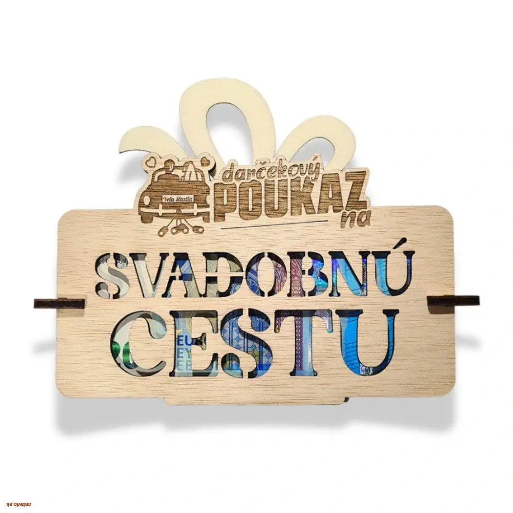Už vás nebaví darovať peniaze na svadbe nudne? Vyskúšajte našu drevenú obálku „Poukaz na svadobnú cestu“, ktorá spája humor, štýl a kreativitu. Vtipný výrez na bankovky vyplníte a výsledkom je darček, ktorý prekvapí aj pobaví.