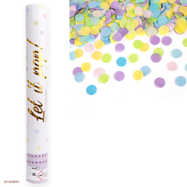 Vystreľovacie papierové konfety v tube s dĺžkou 40 cm sú určené na oslavy, svadby, narodeniny alebo spoločenské podujatia. Po otočení spodnej časti tuby sa konfety uvoľnia a vytvoria vizuálny efekt.